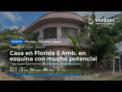 CASA EN ESQUINA CON TERRAZA Y GRAN POTENCIAL – FLORIDA<div style="line-height: 1.2;"><br></div><div style="line-height: 1.2;">Fray Justo Sarmiento 98, Florida, Vicente López</div><div style="line-height: 1.2;"><br></div><div style="line-height: 1.2;">Superficies:</div><div style="line-height: 1.2;">Superficie total: 212 m²</div><div style="line-height: 1.2;">Superficie cubierta: 232 m²</div><div style="line-height: 1.2;"><br></div><div style="line-height: 1.2;">Ambientes: 5</div><div style="line-height: 1.2;">4 Dormitorios</div><div style="line-height: 1.2;">Sala de estar / Playroom</div><div style="line-height: 1.2;">1 Baño completo + 1 Toilette</div><div style="line-height: 1.2;">Terraza</div><div style="line-height: 1.2;">Orientación Norte</div><div style="line-height: 1.2;">Antigüedad: 1960</div><div style="line-height: 1.2;"><br></div><div style="line-height: 1.2;">DESCRIPCIÓN</div><div style="line-height: 1.2;"><br></div><div style="line-height: 1.2;">Propiedad en esquina de excelente presencia, con una arquitectura sólida y ambientes de gran escala, ideal para quienes buscan una casa con carácter, luminosidad y potencial de actualización en una de las zonas residenciales de Florida.</div><div style="line-height: 1.2;"><br></div><div style="line-height: 1.2;">Desarrollada en dos plantas más terraza, esta casa se destaca por sus espacios amplios, distribución funcional y excelente orientación norte, lo que garantiza luz natural durante todo el día.</div><div style="line-height: 1.2;"><br></div><div style="line-height: 1.2;">El ingreso nos recibe con un living principal de generosas dimensiones (5,5 x 5,5 m), un espacio con personalidad, complementado por un sector de bar que refuerza su impronta social y jerárquica.</div><div style="line-height: 1.2;"><br></div><div style="line-height: 1.2;">La cocina, de más de 6,5 metros de largo, ofrece múltiples posibilidades de rediseño, integrando comedor diario y generando un espacio moderno y funcional acorde a las tendencias actuales.</div><div style="line-height: 1.2;"><br></div><div style="line-height: 1.2;">En planta alta se desarrollan cuatro dormitorios bien distribuidos, todos con muy buena ventilación y luz, destacándose el dormitorio en esquina por su amplitud y pisos de madera en espiga, que aportan calidez y estilo.</div><div style="line-height: 1.2;"><br></div><div style="line-height: 1.2;">La casa suma además una sala de estar o playroom con hogar, un espacio ideal para family room, escritorio o área de relax, con salida directa a la terraza.</div><div style="line-height: 1.2;"><br></div><div style="line-height: 1.2;">En el último nivel encontramos una amplia terraza abierta, con vistas al entorno y gran potencial para generar un espacio outdoor de categoría (quincho, solárium o expansión verde).</div><div style="line-height: 1.2;"><br></div><div style="line-height: 1.2;">El patio en planta baja completa la propiedad, con posibilidad de recuperar el ingreso vehicular y sumar cochera.</div><div style="line-height: 1.2;"><br></div><div style="line-height: 1.2;">VALOR DIFERENCIAL</div><div style="line-height: 1.2;"><br></div><div style="line-height: 1.2;">• Propiedad en esquina con excelente presencia</div><div style="line-height: 1.2;">• Gran potencial de modernización y revalorización</div><div style="line-height: 1.2;">• Ambientes amplios y luminosos</div><div style="line-height: 1.2;">• Living de categoría con sector de bar</div><div style="line-height: 1.2;">• 4 dormitorios + sala de estar</div><div style="line-height: 1.2;">• Terraza con posibilidades de desarrollo</div><div style="line-height: 1.2;">• Patio con opción de cochera</div><div style="line-height: 1.2;">• Orientación norte</div><div style="line-height: 1.2;"><br></div><div style="line-height: 1.2;">UBICACIÓN</div><div style="line-height: 1.2;"><br></div><div style="line-height: 1.2;">Ubicada en Florida, Vicente López, en un entorno residencial consolidado, con cercanía a colegios, comercios, transporte público y rápidos accesos.</div><div style="line-height: 1.2;"><br></div><div style="line-height: 1.2;">Una ubicación estratégica que combina tranquilidad barrial con conectividad.</div><div style="line-height: 1.2;"><br></div><div style="line-height: 1.2;">AVISO LEGAL</div><div style="line-height: 1.2;">Las medidas, superficies, antigüedad y demás datos consignados son aproximados y pueden no estar actualizados al momento de la consulta. Los datos exactos surgirán del título de propiedad y/o plano municipal. Las imágenes y descripciones son meramente orientativas.</div><div style="line-height: 1.2;"><br></div><div style="line-height: 1.2;">MATRÍCULAS</div><div style="line-height: 1.2;">CMCPSI 7123 – CUCICBA 9469</div><div style="line-height: 1.2;"><br></div> <br>